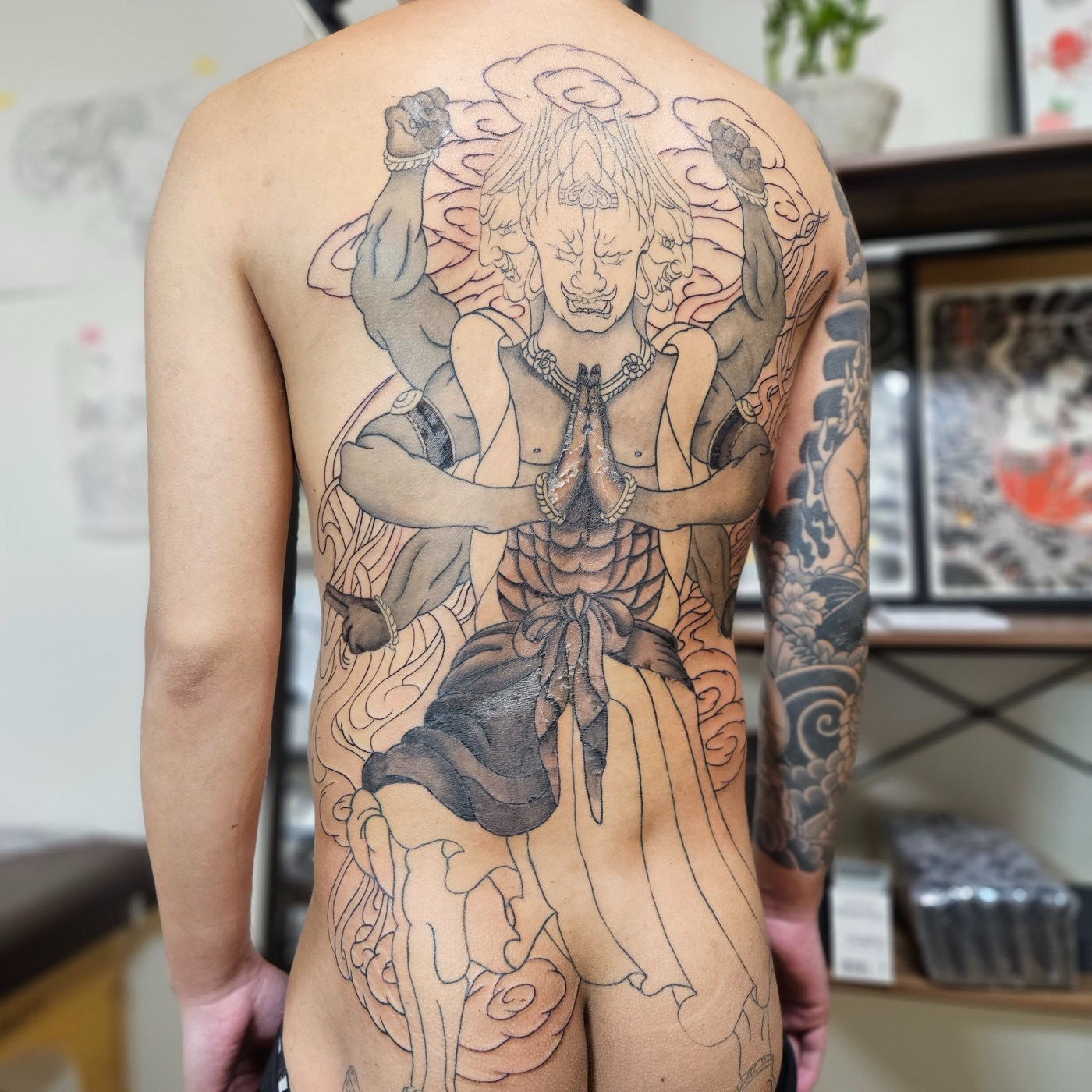 Asura has been updated. I had originally drawn the background, but I didn’t like it, so I changed it. The first one consisted of wind, clouds, mountains, water, and waves, but I added a small vortex of clouds and flames behind Asura.